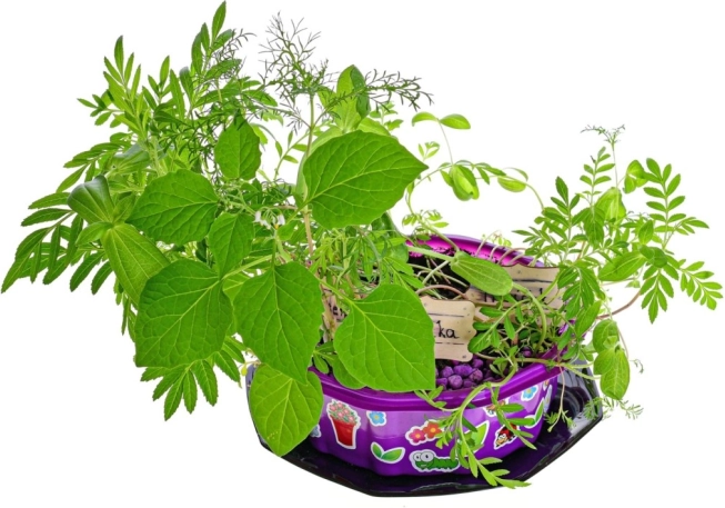 - 4 barve, 3 paketki s semeni (marjetica, cinija, kozmeja), 1 vrečka kokosovih vlaken, 1 čopič, 1 cvetlični lonec s podstavkom, 1 list A4 z nalepkami, 1 tuba bleščic