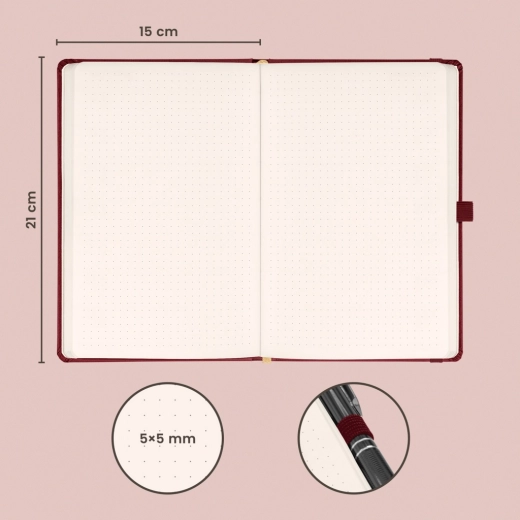 Eleganten in funkcionalen dnevnik NOTIQUE Balacron v bordo barvi s pikčastimi stranmi. Zahvaljujoč kakovostnemu materialu je ta dnevnik izjemno odporen proti poškodbam.
