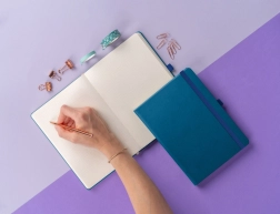 Eleganten pikčast zvezek v modri izvedbi ponuja klasiko in eleganco z najbolj zaželeno površino za enostavno vtiskovanje logotipov podjetij z nežno strukturo.