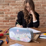 Sodoben motiv v modro-rožnatih odtenkih se ujema s šolskimi dodatki in bo navdušil vse, ki imajo radi svež, igriv slog.