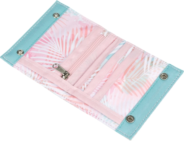 Dizajn s pastelnimi palmami denarnici daje svež videz in se zlahka ujema z nahrbtnikom ali torbico. Kompaktne mere se udobno prilegajo v žep, žep na zadrgo za drobiž pa olajša hitro plačilo in urejanje kovancev.