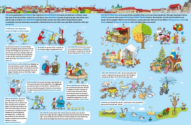 Odkrijte Prago skozi otroške oči z bogato ilustrirano knjigo v nemščini. Otroci bodo obiskali Karlov most, Praški grad, Malostranski trg, Staromestni trg z astronomsko uro in tudi Stromovko – na poti pa jih spremljajo duhoviti junaki in praške prikazni. Slike pripovedujejo zgodbe tudi tistim, ki še ne berejo.