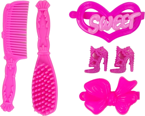 Set vključuje rožnati glavnik, krtačo in druge styling dodatke, ki podpirajo skrb in kreativnost pri igri.