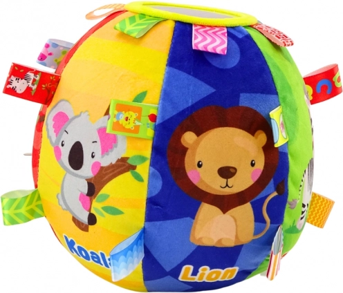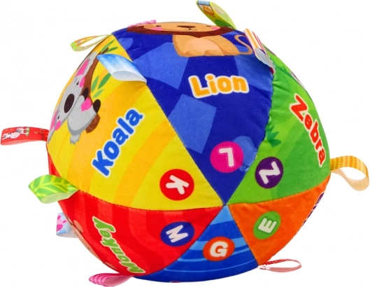 Žogica je razdeljena na več sekcij, pri čemer vsaka ponuja intenzivno barvo s prijaznimi ilustracijami živali, kot so lev, slon, žirafa in zebra. Angleški napisi dodajajo izobraževalni element, pomagajo pri učenju prvih besed in prepoznavanju imen živali v tujem jeziku.