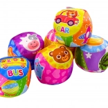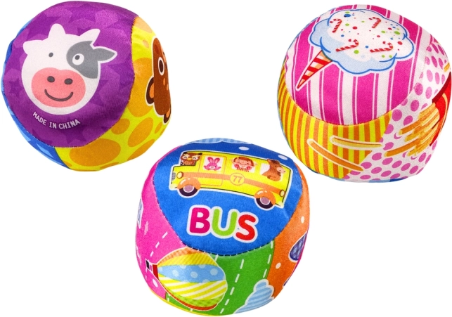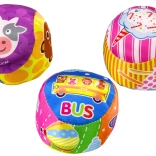 Mehka žogica, okrašena z barvitimi vzorci z motivi živali in sadja, spodbuja otrokovo domišljijo in pritegne pozornost z intenzivnimi, živahnimi barvami. Varen in mehak material zagotavlja, da je idealna za nežne otroške rokice, njena lahka zasnova pa olajša držanje, kotaljenje in metanje.