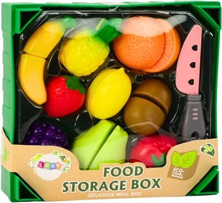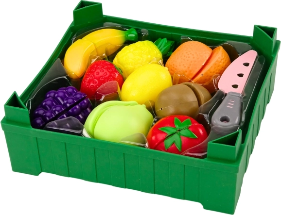 Zelen zabojček služi kot praktično shranjevanje in uči otroke pospravljanja po končani igri. Realistične oblike in barve sadja pomagajo pri prepoznavanju vrst ter spodbujajo zdrave prehranske navade skozi igro.