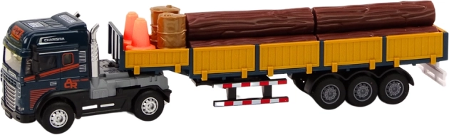Realistični model tovornjaka v merilu 1:24 ponuja modro kabino, odklopni polpriklopnik z odstranljivimi stranicami in tovor v obliki lesenih hlodov. Za še bolj zabavno igro ima svetlobne in zvočne učinke (zagon motorja, vzvratna vožnja) ter prosti tek/natez za vožnjo. Priloženi so tudi prenosni stožci in dve sodčki za scenarije nakladanja in zavarovanja »gradbišča«. Certifikat CE, skladnost z EN71, primerno od 3 let naprej.