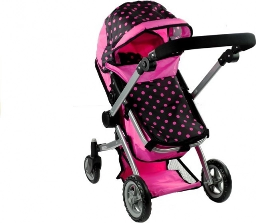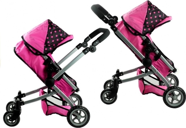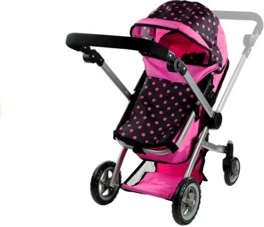 Voziček za punčke Alice 2v1 navduši z realistično izdelavo in vsestransko zasnovo. V hipu ga spremenite iz globokega vozička z gondolo v športni voziček. Kombinacija rožnate in črne s pikami deluje igrivo in moderno, medtem ko trpežna kovinska konstrukcija in kakovostne prevlečne tkanine zagotavljajo dolgo življenjsko dobo.