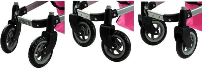 Dve večji zadnji kolesi in dve manjši sprednji vrtljivi 360° olajšujeta vodenje in manevriranje tako v notranjih prostorih kot na prostem. Nastavljiv ročaj prilagodi voziček otrokom različnih višin, zložljiva strešica z pripenjalno odejico proti vetru pa ščiti punčko pred vetrom in soncem. Enostavno vzdrževanje tekstila in mehki penasti ročaj povečujeta udobje pri vsakodnevni igri.