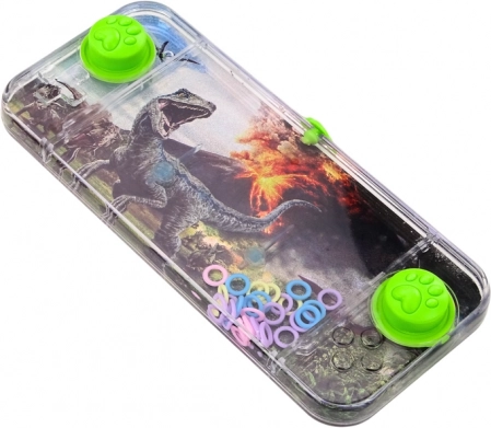 Žepna vodna igra z motivom dinozavra Carnotaurusa je preprosta, a zelo privlačna igrača. V prozornem vodnem rezervoarju se prosto dvigujejo barvni obročki, vaša naloga pa je z dvema zelenima gumboma natančno dozirati tlak, da obročke nataknete na dva izrastka v notranjosti.