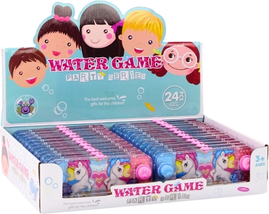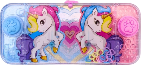 Odkrij klasično vodno igro v moderni rožnati izvedbi z ljubkim samorogom. V prozorni posodi plavajo barviti obročki, tvoja naloga pa je, da jih s tokom vode iz tlačnih gumbov natakneš na dva zatiča. Vsak pritisk ustvari drugačen tok – vse je v natančnosti in občutku.