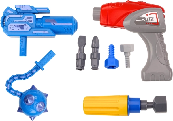 Del kompleta sta otroški vrtalnik in izvijač z zamenljivimi nastavki, ki otrokom natančno pristajajo v roko. Modro orožje in kij dodata igri pustolovščino ter podpirata kreativno pripovedovanje zgodb. Igrača izpolnjuje standarde CE in EN71 ter je primerna za otroke od 3 let.