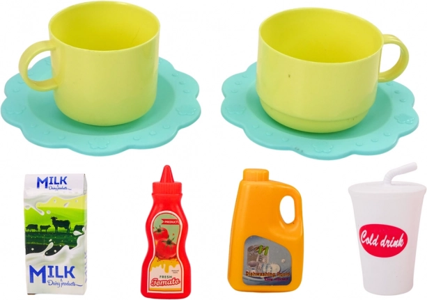 Zabaven kuhinjski set za najmlajše z električnim mešalnikom, ki ima svetlobne in zvočne učinke ter vrtilno funkcijo. Otroci lahko v posodo nalijejo vodo in opazujejo vrtinčenje “koktajla”, režejo sadje z ježkom s plastičnim nožem na deski in strežejo v dveh skodelicah s podstavki. Odlična izbira za razvoj fine motorike, domišljije in igre vlog v varni izvedbi.