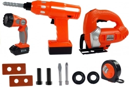 Ta bogato opremljen komplet za male mojstre prinaša realističen doživljaj delavnice. Ergonomično oblikovana orodja lepo sedejo v otroško dlan, baterijsko napajanje pa posnema prave funkcije: vrtalnik vrti in odvija, žaga se premika ter oddaja avtentične zvoke, svetilka močno sveti in jo je mogoče nastaviti po potrebi.