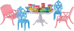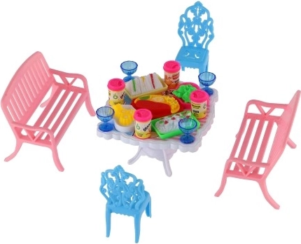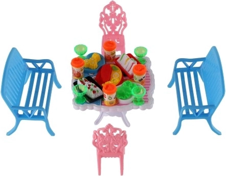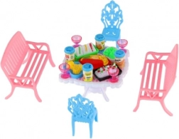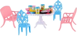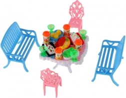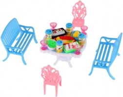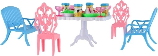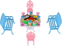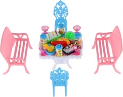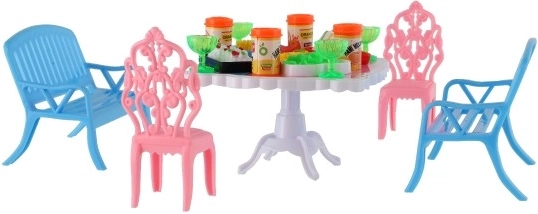 Komplet vsebuje 2 klopi, 2 stolčka in mizo ter 13 kosov dodatne opreme – kozarčke, pločevinke, krožnike in pladenj. Vse, kar potrebujete za gostijo vaših punčk.