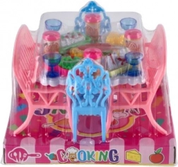 Veseli rožnati in modri elementi z belo mizo ustvarjajo privlačen barvni miks. Realistično izdelani mini dodatki igri na restavracijo dodajo pravi šarm.