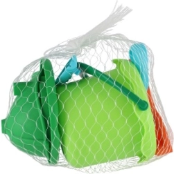 Lahek plastični komplet v živahnih barvah je spravljen v praktični mrežasti vrečki – idealen za peskovnik in za na morje.