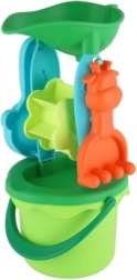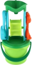 Praktičen komplet združuje vedro s sitom, lopatko in grabljice – idealna oprema za gradnjo gradov in presejevanje peska.