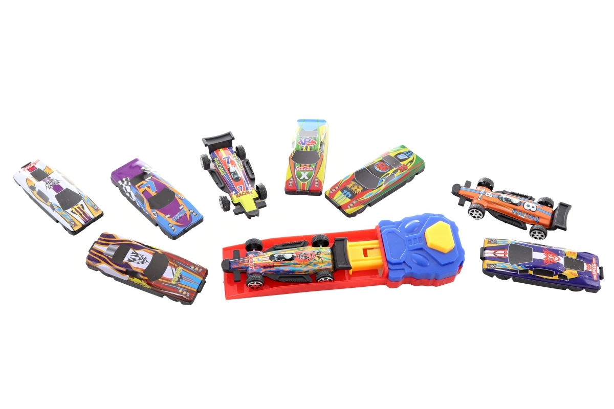 Vsebina pakiranja vključuje 9 kovinskih avtomobilčkov in izstrelitveno osnovo, s katero zlahka ustvarite napete dirkalne scenarije. Kompaktne mere so idealne za igro doma in na poti.