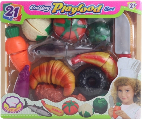 Zabaven in varen set za rezanje za otroke z 21 kosi živil, povezanimi s čičk trakovi (ježki). Otroci lahko hrano večkrat “režejo”, pri tem pa vadijo fino motoriko, koordinacijo in spoznavajo različne vrste zelenjave in pekovskih izdelkov. Idealna igrača za otroke od 2 let.