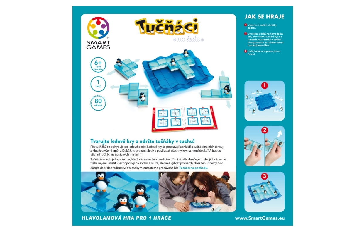 Odkrijte pametno logično igro Pingvini na ledu znamke SMART GAMES, ki uri logično mišljenje, prostorsko predstavo in načrtovanje. Premikajte ledene plošče, postavite pet pingvinov na prava mesta in rešite 60 izzivov od preprostih do zahtevnih. Idealna potovalna igra za enega igralca, v kateri bo uživala vsa družina.