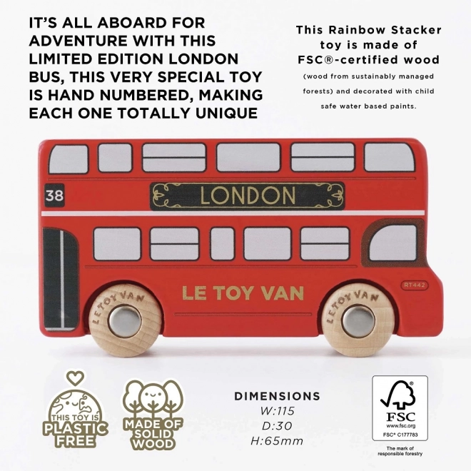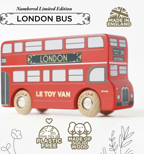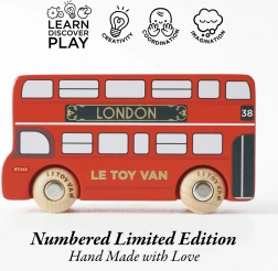 Odkrijte čar Londona s tem lepo izdelanim lesenim avtobusom, ki je združljiv z vsemi garažami in železnicami iz Le Toy Van. Zahvaljujoč robustnim kolesom in trpežnemu materialu s certifikatom FSC® te igrače prinašajo varno izkušnjo v vaše roke.