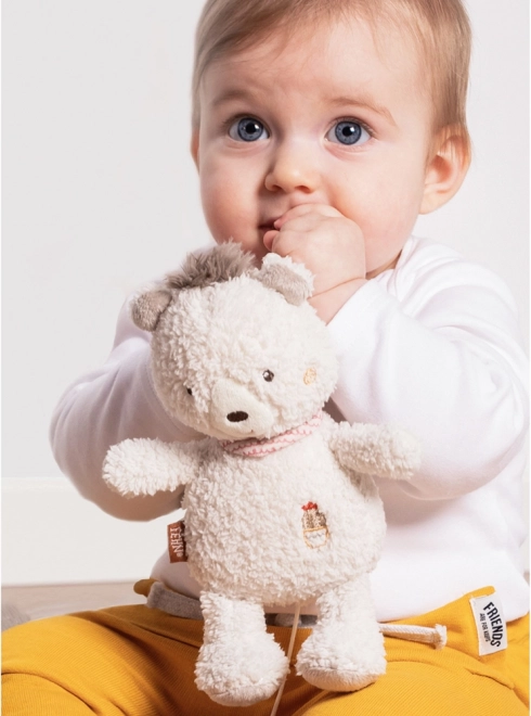 Plišasti medvedek je zasnovan za najmlajše otroke, zato nudi prijetno in varno crkljanje. Igrača je opremljena z glasbenim mehanizmom, ki se aktivira z vlekom za obroček in ga je mogoče preprosto odstraniti z zadrgo. Njegove nežne umirjene barve in mehak material spodbujajo k crkljanju in pomirjajo otroka. Z dvema trakovoma lahko medvedka hitro in enostavno pritrdite na voziček, otroški sedež ali posteljico.