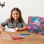 Kovček z motivom plamencev in tropskih rastlin doda slog vsakemu šolarju.