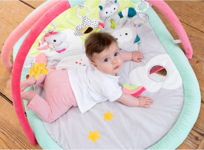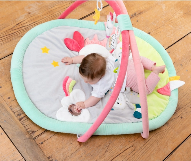 Ta prostorna 3D aktivnostna podloga z nežnim motivom samoroga je zasnovana za udobno in varno igro dojenčkov od rojstva dalje. Kombinacija mehkega pliša, velurja in drugih prijetnih materialov nudi prijeten prostor za počitek in zabavo. Viseče igrače na loku – piskajoči samorog s skritim hrčkom, ropotajoča mačka, čivkajoči oblaček in šumeča zvezda – spodbujajo radovednost in urijo prijem.
