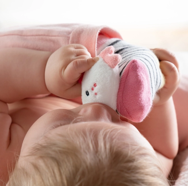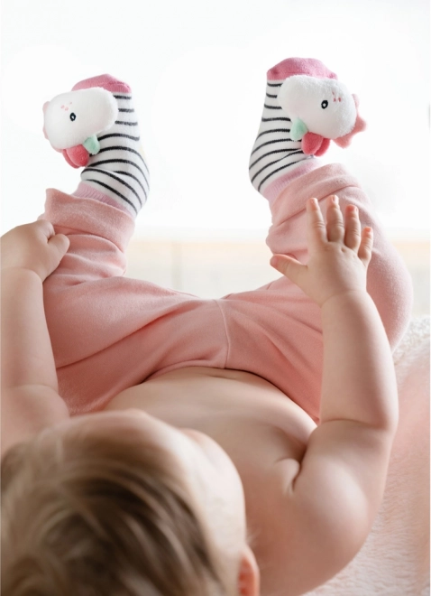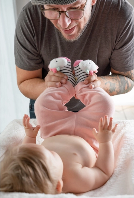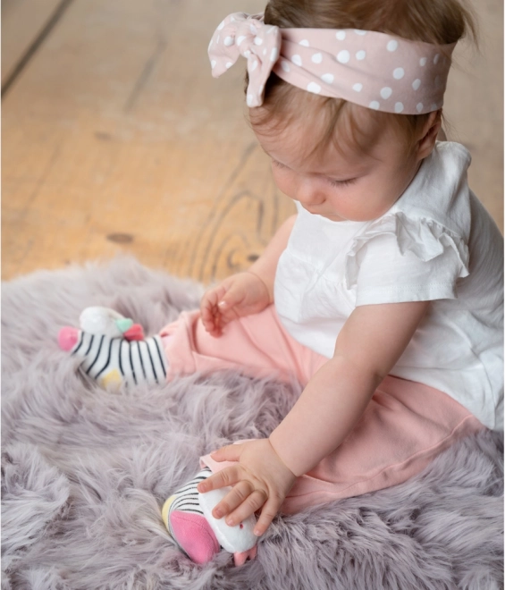 Plišasta glavica na prstih ob vsakem brcanju nežno zaropota ter spodbuja otroka k igri in naravnemu gibanju nožic.