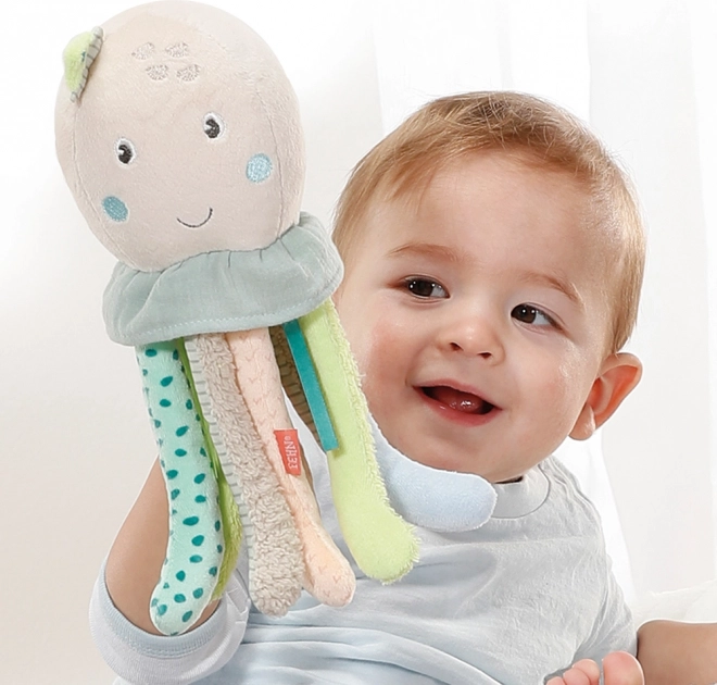Prisrčna glasbena igrača v obliki hobotnice iz kolekcije OTROCI MORJA dojenčkom že od rojstva pričara občutek miru in varnosti. Ko jo navijete, zaigra nežna uspavanka, ki pomaga ustvariti prijetno vzdušje pri uspavanju in čez dan.