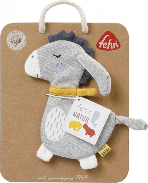 Pleteno telo oslička je izdelano iz organskega bombaža, v notranjosti pa je šumeči papir, ki ob stiskanju oddaja zvok. Igrača za prijemanje tako na igriv način spodbuja sluh, prijem, tip in fino motoriko dojenčka. Praktična velikost omogoča, da oslička vzamete s seboj kamor koli.
