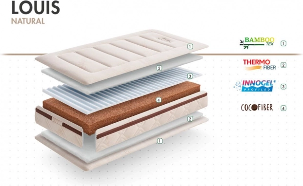 Jedro iz kokosovih vlaken je 100 % naravno in okolju prijazno. Zagotavlja visoko zračnost in optimalno prezračevanje. Zahvaljujoč sloju Visco Innogel® ima vzmetnica Louis odlično prilagodljivost.