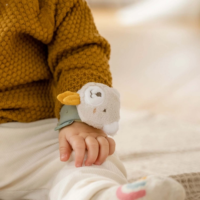 Enostavno se namesti na roko; ob gibanju dojenčka – tresenju rokic – oddaja fascinantne zvoke, ki jih malčki obožujejo. Ropotajoča zapestnica na igriv način podpira dojenčkov sluh, prijem, tip in fino motoriko.