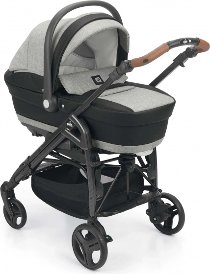 Globoka košara s teksturirano tkanino in detajli iz eko usnja. Z izklopom opore jo spremenite v udobno zibelko, idealno za pomiritev dojenčka.