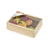 Praktična lesena škatla s prozornim pokrovom služi kot shranjevalni box in kot razstavna vitrinca, zato imate vse dele vedno skupaj. Komplet je odličen za samostojno igro ali skupno kuhanje s starši.