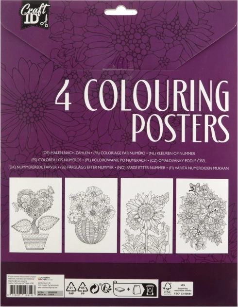 Odkrijte svet ustvarjalnosti z našimi plakati za barvanje znamke Craft ID. Vsako pakiranje vsebuje štiri plakate, ki vas popeljejo v umetniški svet poln domišljije. Plakati vključujejo podrobne ilustracije, od cvetličnih motivov do živalskih obrazov, ki čakajo na vaše barve.