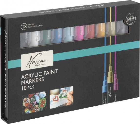Odkrijte čar ustvarjalnosti z akrilnimi flomastri znamke Nassau Fine Art. Set vsebuje deset barvnih flomastrov, ki so idealni za uporabo na platnu, keramiki, lesu, steklu in plastiki. Njihova univerzalna uporaba umetniku omogoča svobodno eksperimentiranje z različnimi tehnikami in slogi.