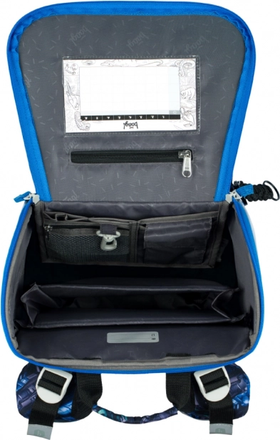 Pametna notranja razporeditev s preklopnim odpiranjem omogoča hiter dostop do pripomočkov kar iz klopi. Vsebuje prozoren žep za urnik, notranji organizator z elastiko za fiksiranje, izoliran sprednji žep za malico, čvrste stranske žepe za steklenico, odporno dno za stabilnost in izrazite odsevne elemente za varnost. Set dopolnjujeta enonadstropna peresnica z zadrgo YKK in praktična vrečka s karabinom ter spodnjim žepom na zadrgo.