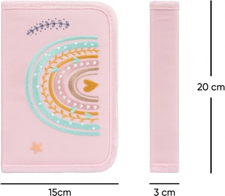 Praktičen in moderen peresnik v rožnatih pastelných tonih z motivom mavrice bo razveselil šolarje in dijake. Enonadstropna izvedba z dvema preklopoma omogoča pregledno organizacijo in hiter dostop do vseh potrebščin. Vzdržljivi materiali in zadrga YKK zagotavljajo dolgo življenjsko dobo pri vsakodnevni uporabi.