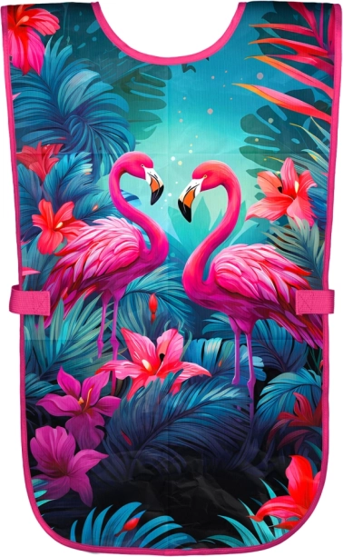 Praktična dva žepa v spodnjem delu zlahka shranita čopiče, barvice in drobne pripomočke, medtem ko nastavljive naramnice poskrbijo, da predpasnik dobro pristaja otrokom različnih starosti. Slogovni motiv flamingov s tropskimi elementi bo navdušil vsakega malega ustvarjalca.