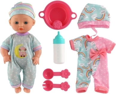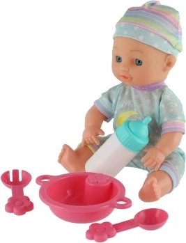 V pakiranju najdete celoten jedilni set s stekleničko, posodico, žličko in vilico ter dodatno oblekico za preoblačenje. Igra z lutko razvija fino motoriko, domišljijo in otroke na zabaven način uči odgovornosti.