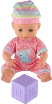 Prisrčen dojenček s trdim plastičnim telesom bo razveselil vsako malo mamico. Punčka velikosti 25 cm je oblečena v rožnati komplet, priložena pa je tudi igralna kocka. Idealno za razvoj domišljije in igre vlog, spodbuja fino motoriko in negovalne veščine otrok.