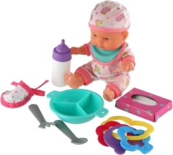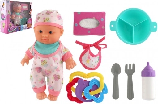 Del pakiranja so steklenička, ropotuljica, vlažilni robčki in jedilni set za malčke, ki podpirajo realistično igro ter razvijajo motorične spretnosti in socialne vloge.