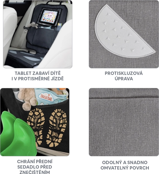 STOP drsenju: Proti-zdrsna površina pomaga preprečiti drsenje otroških avtosedežev s sedeža. Zavihka na zadnji strani dodaja dodatno možnost varnega pritrjevanja in zagotavlja maksimalno stabilnost.