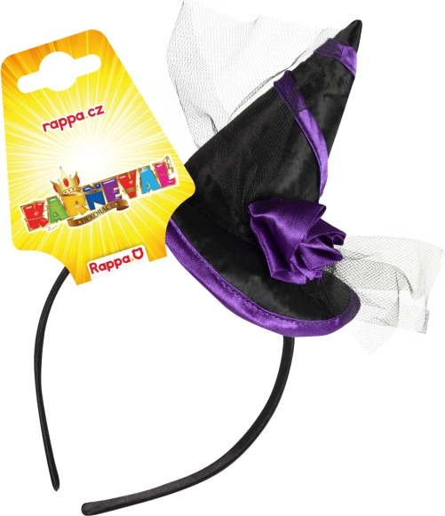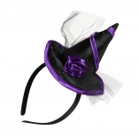 Stajliš čarovniški naglavni trak je popoln dodatek za zabavo, pustni karneval in noč čarovnic. Združuje črno‑vijolično izvedbo, satenast mini klobuček in tilast cvetlični okras za izrazit in fotogeničen videz.