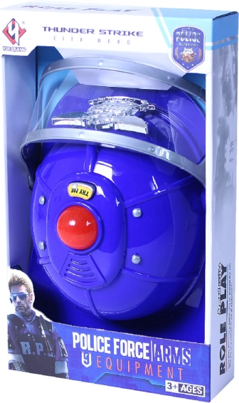 Policijska čelada za male junake z zaščitnim ščitnikom, ki utripa in igra ob pritisku na gumb. Nastavljiva velikost za udobno nošenje.