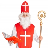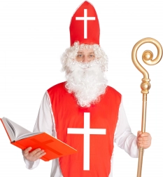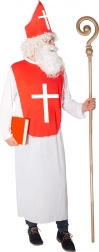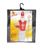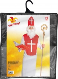 Ta Miklavžev kostum za odrasle sestavljata dolgo belo oblačilo (pribl. 145 cm od ramen) in rdeča napernica z izrazitim belim križem. Del kompleta je tudi kapa z zapiranjem na ježka za hitro in varno pritrjevanje. Zaradi univerzalnega kroja je kostum udoben za nošenje in ga je preprosto plastiti.