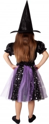 Ta ljubek kostum čarovnice bo navdušil vse male ljubiteljice čarobnosti. Združuje elegantno črno z očarljivo vijolično, bleščeče zvezde in lahek til za resnično magičen videz. Špičast klobuk se ujema z obleko in zaokroža popoln outfit za karneval, Noč čarovnic ali šolske prireditve.
