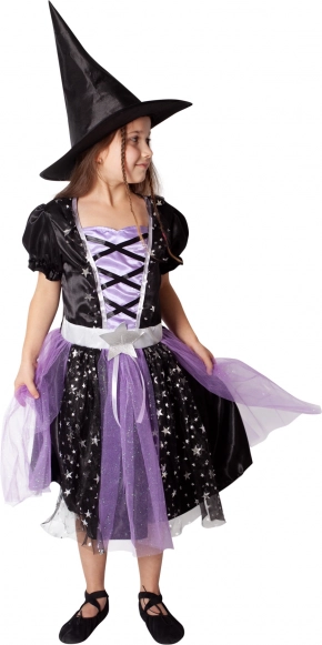 Privoščite mali čarovnici popolnoma čaroben outfit. Ta črno‑vijoličen kostum s srebrnimi zvezdami pritegne pozornost na vsakem pustovanju, otroški zabavi in za noč čarovnic. Stilski detajli, kot sta okrašen životec in napihnjeni rokavčki, obleki dodajo avtentičen videz, špičasti klobuk pa zaokroži celotno preobrazbo.